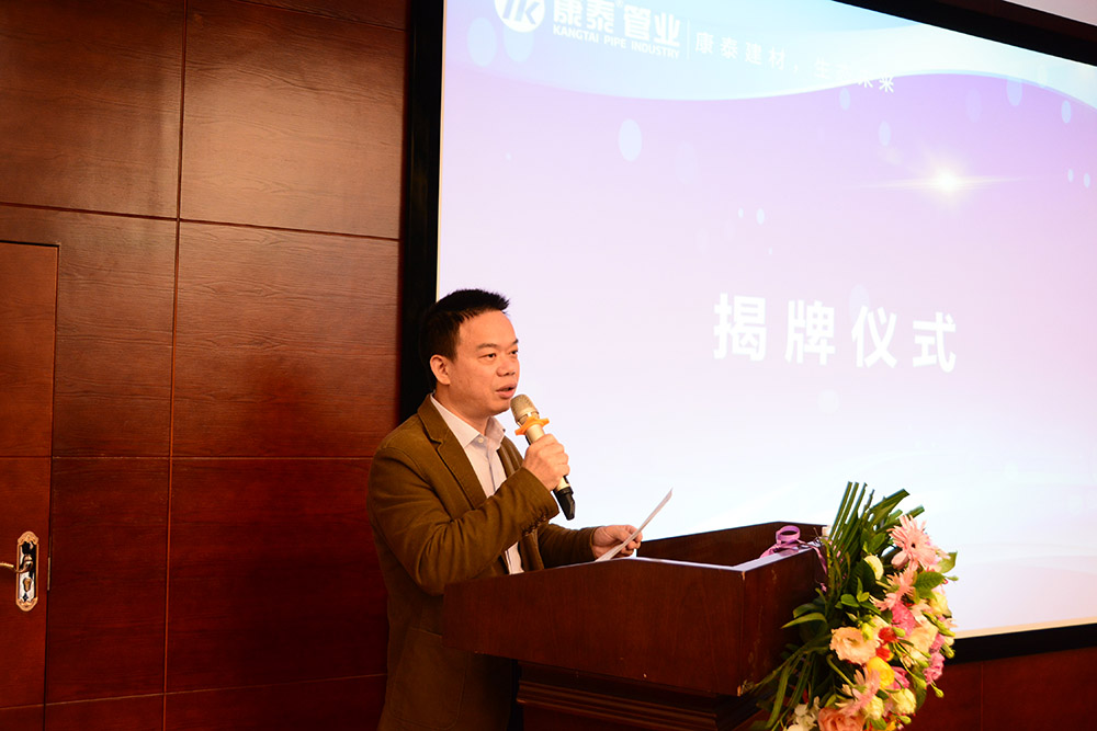 領導致辭結(jié)束后,四川省土木建筑學會給水排水專業(yè)委員會主任委員王家良宣讀了《四川省土木工程學會給水排水專業(yè)委員會關于“塑膠管道工程技術中心”暨“塑膠管道聯(lián)合科研基地”的批復》的文件。隨后,在熱烈的掌聲中,四川省建設廳副廳級巡視員馮江,崇州市科學技術協(xié)會主席楊建,四川省土木建筑學會給水排水專業(yè)委員會主任委員王家良,康泰塑膠科技集團董事長兼總裁林云青共同為“塑膠管道工程技術中心”暨“塑膠管道聯(lián)合科研基地”揭牌。