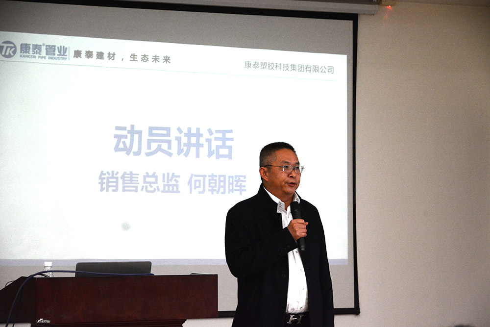 銷售總監(jiān)何朝暉在動員講話中首先對銷售生力軍的加入表示了歡迎。并表示,做營銷,首先要了解產(chǎn)品,更要全面熟悉、了解康泰的發(fā)展歷程、企業(yè)文化和發(fā)展戰(zhàn)略,聚焦塑膠管道未來的發(fā)展趨勢,做到戰(zhàn)必勝,勝必果。