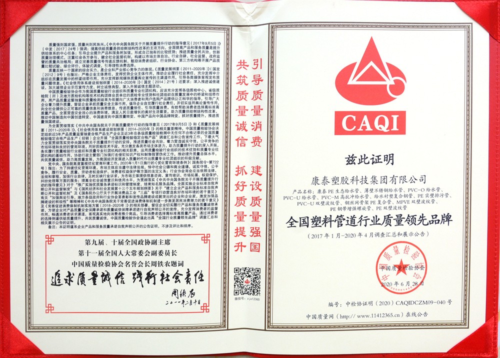 近日,康泰在中國質量檢驗協會主辦主題活動中,榮獲“全國質量誠信先進企業(yè)”稱號,同時還獲得“全國塑料管道行業(yè)質量領先品牌”、“全國質量檢驗穩(wěn)定合格產品”等榮譽。